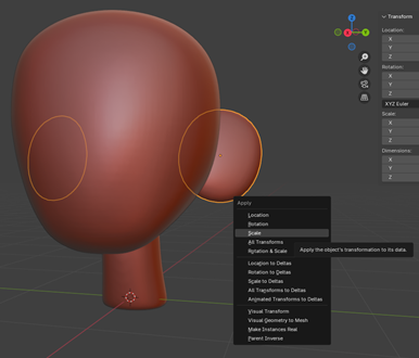 If you want to set the ear’s current scale as its new default scale, go into object mode, hit CTRL+A to open the apply menu, then click “Scale”. This makes it a little easier to work with while sculpting.