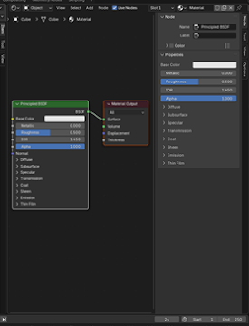 You don’t have to paint every material onto the mesh like before – only if you know there’s going to be complicated blending or suchlike. In Object Mode, you can just go to the mesh’s Materials menu (with the symbol of the red beach ball) and add new materials in that way. You have options here such as Metallic, that makes the mesh more metal-y, and roughness, which makes the mesh more or less smooth and shiny (so low roughness would be good for things like eyes).